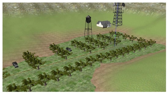 It is possible to observe the clearness of the training environment when facing the complexity of the test one. This is to improve the simulation time step, which improves the time spent training the model. The training environment has only twenty two models, including UAV (Figure 7), pickup (Figure 5b), and olive trees (Figure 5c). The olive trees are the static models, while pickup can move in the plane changing acceleration and velocity by every agent’s iteration with the environment. Equation (5) shows how these two vectors are described, using as a random vector to describe the orientation and to determine the module.
