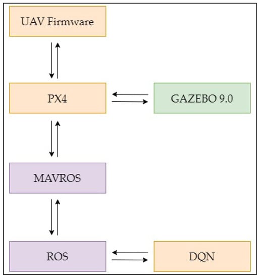 Framework overview. Gazebo simulates all the environments which interact with the UAV FCU PX4. DQN algorithm controls the agent via ROS/MAVROS.
