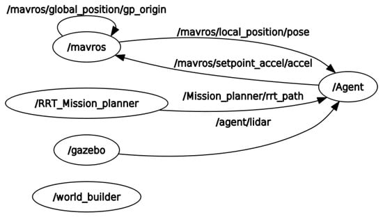 Figure 6 presents the designed scenario for testing the proposed methodology. Note that this UAV included a PixHawk PX4 flight controller unit (FCU). The MavLink communication protocol was used for telemetry and offboard controllers. ROS Kinetic was used for developing the controller, the trajectory calculation, and camera node packages in the Python programming language. The MavLink was simulated through the MavROS package. Figure 8 shows an overview of the implementation.