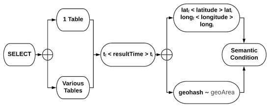 To cover the range of queries required, a complex query with different requirements for the retrieval of data will be described, as well as a set of queries made by splitting the original complex query. The original query should present a minimum of one attribute per dimension; this means at least a time interval, an area geolocated, and an attribute to describe some semantics about the desired data to be extracted. In addition, the complex original query is going to be adapted to three different configurations, varying the size of the time and geoposition windows of the search. The original query is described in Figure 3.