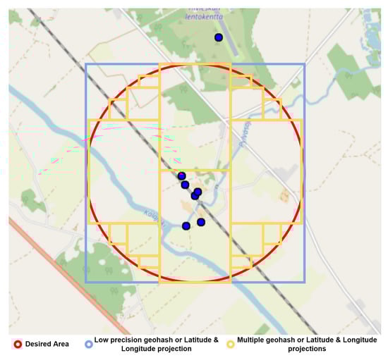 During the evaluation stage of the spatial clause construction for data gathering, three types of filtering have been described (see Figure 4). (i) Circumscribed bounding box defined through low precision geohash projection; (ii) multiple geohash or latitude and longitude projections of different precision to adjust to the search area; (iii) circumscribed bounding box defined by two points (latitude and longitude) determining the diameter of the search area. After repeating the set of tests defined in the experimentation section, it has experienced delays that are too high for the first two configurations, even reaching the timeout configured on the server, making an agile query unfeasible, close to real-time. This was the expected result, as the TSDBs are designed to optimize retrieval time under temporal filter conditions, increasing its response time when the number of semantic predicates is increased or in response to “like” type queries (Like type queries are queries based on matching patterns. In the case of the spatial predicate of a query, it could be used to filter by those geohashes that start with a certain pattern. This allows the accuracy of the search geohash projection to be adapted). However, agile responses were obtained for the delimitation of areas by means of rectangles made up of two latitude and two longitude coordinates. Therefore, the options of processing with geohash or with more than one delimitation area for the composition of a superior area have been discarded from the experimentation. This is due to the lack of sufficient performance for a production scenario, and because it exposes the server to a load too high for concurrent accesses.