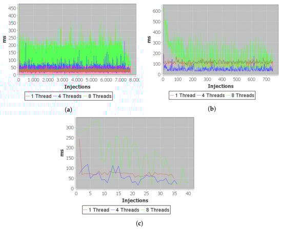 - Isolated vs. Concurrent injections (Section 4.5). The response of the injection engine to injection requests from one or more client-threads is analyzed. It allows drawing a performance curve according to the type of database attack (Ind-I and IV).
