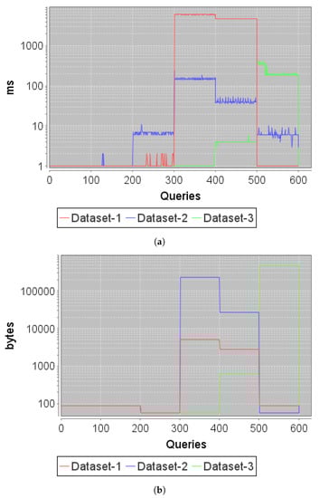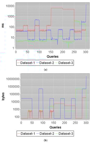 The process is repeated with the battery of queries for dataset-2 and 3, and a similar behavior to that described by the experiment carried out with dataset-1 is observed (see Figure 9b,c).