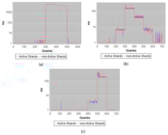 Comparison between access to active and inactive shards. Response time in ms (milliseconds). (a) Dataset-1 queries. Access from non-active shards or from active shards. (b) Dataset-2 queries. Access from non-active shards or from active shards. (c) Dataset-3 queries. Access from non-active shards or from active shards.