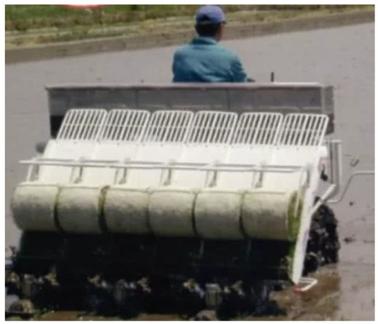 Many studies have been conducted on autonomous rice transplanters [2,3,4,5,6]. Straight line tracking, head-turning, and the automatic splicing of rows have been achieved. The lateral deviation is less than 5 cm, which meets the operating accuracy and agronomic requirements of rice transplanting. However, the automatic device which can load rice seedlings for seedling boxes has not been developed. The rice seedling is still needed to load into the seedling box manually, thus the operation of the autonomous rice transplanters continues to need a manual intervention. The complete autonomous operation of the rice transplanter has not been fully developed. An unmanned transplanter currently carries at least one person to load the seedling pieces into the seedling box. The mat-shaped rice seedling was widely applied in rice transplanting. Since the fresh seedlings is the flexible and easily broken and the seedling tray is needed to be removed before loading the seedling pieces into the seedling box, it is difficult to develop the automatic supplying seedling device. Therefore, automatic supply seedling technology is the common key technical problem facing the existing unmanned transplanter.