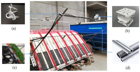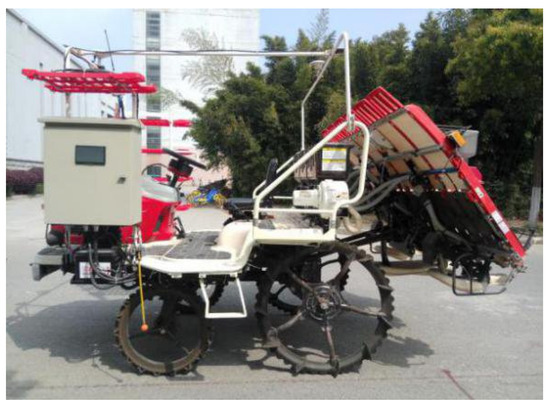 A six-row autonomous rice transplanter (2ZG-6DM, Nantong Fulaiwei Agricultural Equipment Co., Ltd., Nantong, China), as shown in Figure 2, was used as the experimental platform.