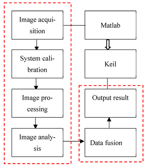 According to software function analysis, the whole fault diagnosis of the seedling pieces and seedling remaining amount monitoring can be divided into two parts. One part is based on Matlab software for system calibration, image acquisition, processing, and analysis. The other is the data fusion and the output of the processing results based on Keil software, as shown in Figure 21.