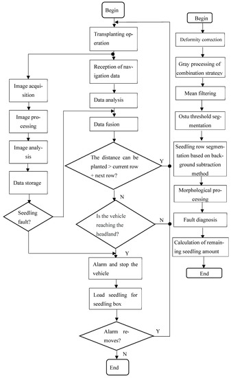Conventional mat-type seedlings are still widely used in autonomous rice transplanters and automatically supplying seedling devices suited to conventional mat-type seedlings is difficult to develop. Thus, an autonomous rice transplanter carries at least one person to load the seedling pieces into the seedling box, which has led to an increase in the labor force and low operational efficiency. To solve this problem from another point of view, a machine vision-based system for the real-time monitoring of the seedling amount in a seedling box is developed. This system aims to achieve the monitoring of the fault of seedlings and seedling amount in the seedling box. According to the real-time and accuracy requirements of the image, the image acquisition platform is designed based on a previously developed autonomous rice transplanter. A camera model was developed and camera parameters for correcting the image distortion is obtained. The image processing method and segment method of seedling rows are presented. The algorithms for fault diagnosis and the calculation of the number of remaining seedlings are proposed by image analysis. The software is developed for seedling box fault diagnosis and monitoring the remaining number of seedlings. Field experiments are carried out to test the effectiveness of the developed monitoring system. The experimental results show that the image processing time is less than 1.5 s and the relative error of the seedling amount is below 3%, which indicates that the designed monitoring system can accurately realize the fault diagnosis of the seedling pieces and monitor for the remaining amount of each row. By combining the navigation information, the developed monitoring system can predict the distance from which the remaining seedlings in the seedling box can be planted, which can guarantee remaining seedlings in a seedling box are enough for transplanting until the rice transplanter returns to the supplying seedling site. This implies that one person can provide seedlings for multiple autonomous rice transplanters. This study was limited to supplying the seedling when the rice transplanter passed through the place of the seedling storage situated at the headland. In the future, we decide to conduct a study on path planning of breakpoint endurance so that the rice transplanter can automatically return to the supplying seedling place when the seedling amount in the seedling box is not enough.