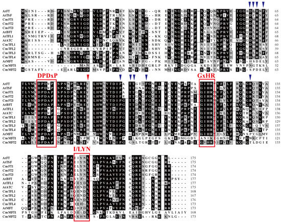 The putative Chrysanthemum and Arabidopsis PEBP amino acid sequences were aligned using the ClustalW method and were edited in BioEdit. Identical and similar residues are shaded in black and gray, respectively. The proposed consensus sequence DPDxP, the GxHR motif, and I/LYN were highlighted with the boxes, respectively. The blue triangles indicate amino acid residues that interact with 14-3-3 proteins. The red triangle indicates a key amino acid residue that may determine FT-like and TFL1-like functions.