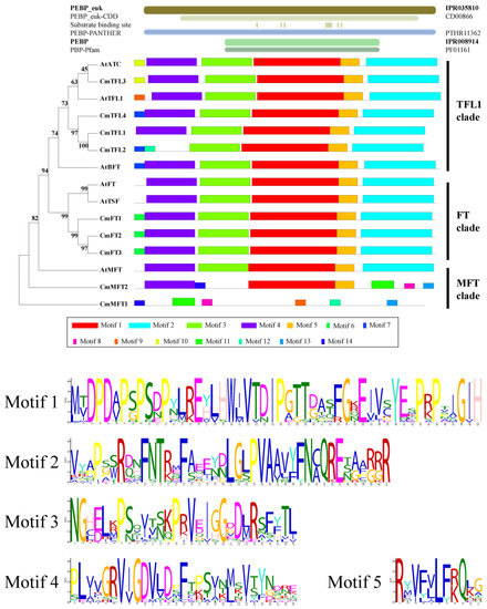 A phylogenetic tree was constructed, and 14 discrete motifs were found, using AtPEBPs and ZmPEBPs to further assess and classify the CmPEBPs (Figure 3). The PBP domain might consist of motifs 1–5. Because of the lack of motifs 1–5, the CmMFTs were clearly distinguished, and because of the lack of motif 4, CmTFL2 was separated from the other TFL-like and FT-like members. Among all the CmPEBPs, motifs 6–14 were highly diversified. Thus, the CmFT proteins were relatively consistent, whereas the CmTFL proteins showed more diversified changes. The CmPEBPs could be classified into four clades when analyzed together with the motifs. Motif 1 might be contained in the proposed consensus sequences DPPxP and GxHR, whereas motif 2 might be contained in the LYN triad. These motifs might be involved in the binding of the substrate; thus, more studies are needed to clarify this relationship. The results of the MEME prediction suggested evolutionary conservation in the basal architecture of the PEBP family members.