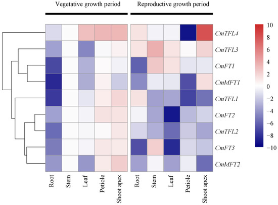 The tissue specificity of CmPEBP gene expression might be closely associated with the physiological and biochemical functions of each tissue. Therefore, analyzing CmPEBP gene expression in specific tissues and organs is important. The transcript abundance of nine CmPEBP genes in five tissues, including the roots, stems, leaves, petioles, and shoot apices, was obtained. These genes were ubiquitously expressed in all the tissues with variable transcript levels (Figure 4 and Figure S4). In the vegetative growth stage, most of the CmPEBP genes showed lower expression levels in the roots and leaves, while they showed higher expression levels in the petioles and shoot apices. In the reproductive growth stage, most of the CmPEBP genes (CmFT1, CmFT2, CmFT3, CmMFT1, CmTFL1, and CmTFL2) showed expression levels that were several folds lower in the leaf and petiole tissues, whereas some of the other CmPEBP genes (CmTFL1, CmTFL2, and CmTFL4) showed higher expression levels in the root and stem tissues compared with the other three tissue types. Overall, each CmPEBP gene showed tissue-specific expression patterns [18,31], although the levels of expression varied greatly.