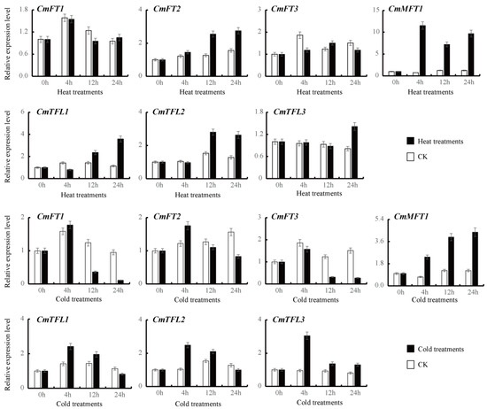 The genes under different temperatures had diverse expression patterns. The TFL-like genes were significantly upregulated in response to 24 h heat stress (Figure 5). Particularly, CmTFL1 and CmTFL2 showed expression levels that were several folds higher after 24 h heat stress. In contrast, the highest levels of CmTFL1, CmTFL2, and CmTFL3 were observed at 4 h in response to cold stress. The transcript levels of the FT-like genes (CmFT1 and CmFT3) were downregulated with cold stress, while the FT-like genes displayed no significant changes in response to heat stress. Notably, CmMFT1 was upregulated at least five fold in response to heat and cold stress. Similar conclusions were drawn from previous studies [25,39].