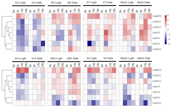 Hormones play an important role in the flowering process of plants [42,43,44,72]. For example, the IAA content is significantly lower in early-spring-flowering plants than in unflowered plants, whereas the content of GA3 and ABA is higher [73]. To better understand the changes in the PEBP family genes in the Chrysanthemum under hormone treatments, a qRT-PCR experiment was performed. Plant materials were divided into dark and light treatment groups, and they were subjected to various hormone treatments, such as IAA (100 μM), 6-BA (100 μM), GA (100 μM), ABA (100 μM), ET (100 μM), SA (100 μM), MeSA (100 μM), and MeJA (100 μM). The differential expression levels of the CmPEBP genes were observed under the hormone treatments (Figure 6).