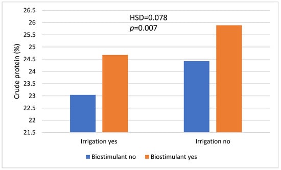 Crude protein content in pea seeds after application of irrigation and biostimulant. HSD, honestly significant differences.