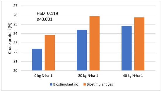 Crude protein content in pea seeds after application of nitrogen fertilization and biostimulant. HSD, honestly significant differences.