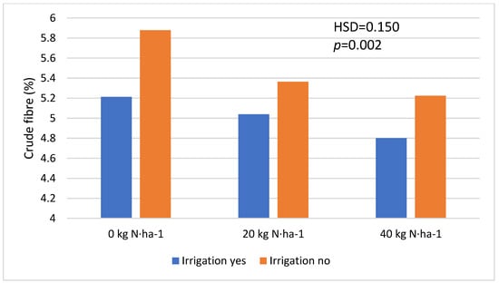 Crude fiber content in pea seeds after application of nitrogen fertilization and irrigation. HSD, honestly significant difference.