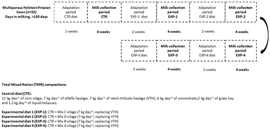 The CTR diet was mainly composed of corn silage + alfalfa haylage + vetch-triticale + grass haylage. Experimental diets 1 and 2 (i.e., the EXP-1 and EXP-2 groups) were diets containing a mixture of silages with winter cereals (WC) and Italian ryegrass (IRG); these diets will henceforth be referred to as WC + IRG, whereas experimental diets 3 and 4 (EXP-3 and EXP-4) were diets containing mixed silage with winter cereals (WC) (commercial product producer: Agroteam S.p.a., Torrimpietra (RM), Via di Granaretto, 26, 00054 Rome, Italy). The selection of these experimental mixtures was based on affordability, the availability of seed materials, nutritive value, and the ease with which one can cultivate the forage.