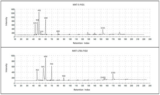 Figure 2 shows the chromatograms of a milk sample, as measured using the two GC columns of an AlphaMOS Heracles Neo (one is polar, MXT-5, and the other, MXT-1701, has medium polarity), which were used for the sensor data representing the smell fingerprint.