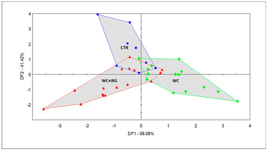 Discriminant factor analysis (DFA) score plot of the milk samples collected from cows fed with the five diets containing the different forage sources, as performed via the selected sensors (CTR (blue square): control diet; WC + IRG (red triangle): diets containing winter cereals and Italian ryegrass; WC (green diamond): diets containing winter cereals).