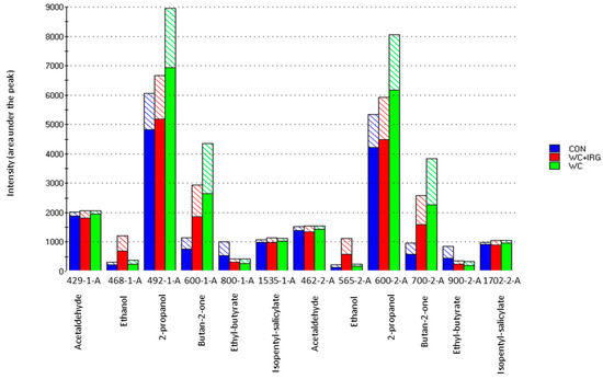 Figure 5, in columns 1 and 2, show the most significant odor compounds that were detected. Furthermore, as based on the RIs, acetaldehyde (429-1-A, 462-2-A), ethanol (468-1-A, 565-2-A), 2-propanol (492-1A, 600-2-A), butan-2-one (600-1-A, 700-2-A), ethyl-butyrate (800-1-A, 900-2-A), and isopentyl salicylate (1535-1-A, 1702-2-A) were identified. Figure 5 also confirms that the WC milk samples possessed the most specific odor. The reason for this is that the sensor signals (odor intensities) of 2-propanol and butan-2-one were more prominent within these samples.