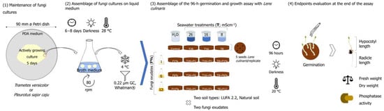 Two white-rot fungi belonging to the group Basidiomycota were used to produce the filtrates employed in this work: Trametes versicolor and Pleurotus sajor caju. Individual cultures of each species of fungi were maintained in sterilized Petri dishes in potato dextrose agar (PDA, 39 gL−1, Merck, Darmstadt, Germany), in the dark, at an optimal growth temperature of 28 °C. Replication of the fungi cultures was performed once a week. The individual liquid-growing fungi cultures were then established in sterilized 250 mL Erlenmeyer flasks (20 min, at 121 °C, 1 bar; Uniclave 88, AJC) by inoculating previously sterilized broth medium (100 mL, NutriSelect® Basic, Merck & Co., St Louis, MO, USA) with 6–8 discs (7 mm ø; average biomass of each disc of 73 mg and 80 mg for T. versicolor and P. sajor caju, respectively) from actively growing cultures of each fungus. Liquid-growing cultures were left to grow for approximately 8 days in an orbital shaker (80 rpm) at 28 °C in total darkness. After this period, the exudates were collected and filtered through 0.22 µm GF/C 55 mm ø filters (Whatman, Munich) and maintained under refrigerated conditions (4 °C), for less than a week, until use in the germination and seedling growth experiments []. This was considered the exudate at 100%, which was then diluted according to the fungi exudate percentages that were intended.