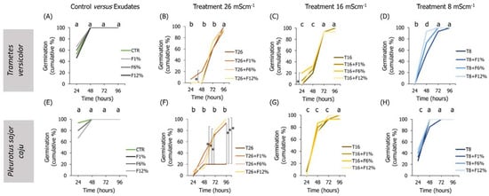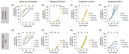 Lens culinaris germination rates, at 96 h, in LUFA 2.2 soil salinized at three different levels (8, 16, and 26 mS·cm−1, designated as T8, T16, and T26, respectively) and supplemented with fungi exudates at three levels (1%, 6, and 12%, designated as F1%, F6%, and F12%, respectively). Graphics (A–D) present the results obtained from soil moistened with Trametes versicolor exudates, and graphics (E–H) present the results obtained from soil moistened with Pleurotus sajor caju exudates. CTR stands for control soil. Letters (a, b, c, d) stand for homogenous groups assessed only between CTR and the salinity treatments within each observation time for the germination endpoint (24, 48, 72, or 96 h; Holm-Sidak, p < 0.05). The * stands for statistical differences between treatments within each time period (Holm-Sidak, p < 0.05).
