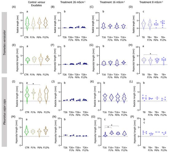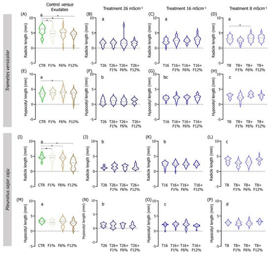 Violin plots of the seedling length of Lens culinaris germinated in natural soil salinized at three different levels (8, 16, and 26 mS·cm−1, designated as T8, T16, and T26, respectively) and supplemented with fungi exudates at three levels (1%, 6, and 12%, designated as F1%, F6%, and F12%, respectively). Graphics (A–H) present the results obtained from soil moistened with Trametes versicolor exudates, and graphics (I–P) present the results obtained from soil moistened with Pleurotus sajor caju exudates. CTR stands for control soil. Letters (a, b, c) stand for homogenous groups assessed only between CTR and the salinity treatments at 96-h in each assessed endpoint (Holm-Sidak, p < 0.05). The * stands for statistical differences between treatments (Holm-Sidak, p < 0.05). Note: Data represented only by points means that no sufficient points were available for the construction of the violin.