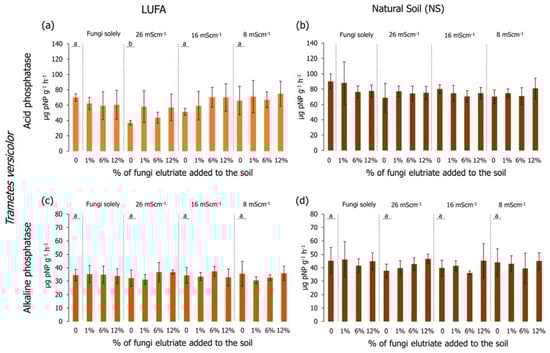 Acid (graphics a,b) and alkaline (graphics c,d) phosphatase activity (pNP/g soil/h) at the end of the 96-h germination and seedling growth assay with Lens culinaris in which two different soils at three salinity levels (mS·cm−1) were supplemented with Trametes versicolor rot fungus exudates. Vertical bars represent the standard deviation. Letters indicate homogenous groups between salinity levels solely (Holm-Sidak, p < 0.05).
