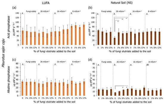 Acid (graphics a,b) and alkaline (graphics c,d) phosphatase activity (pNP/g soil/h) at the end of the 96-h germination and seedling growth assay with Lens culinaris in which two different soils at three salinity levels (mS·cm−1) were supplemented with Pleurotus sajor caju rot fungus exudates. Vertical bars represent the standard deviation. Letters indicate homogenous groups between salinity levels solely (Holm-Sidak, p < 0.05). Asterisks (*) indicate significant statistical differences between treatments and the respective salinity treatments (Dunnett’s, p < 0.05).