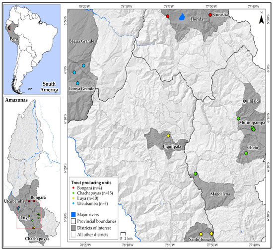 Of 60 trout production units in Amazonas registered in the Peruvian aquaculture cadastre (http://catastroacuicola.produce.gob.pe/web/ accessed on 20 November 2020), a total of 37 were evaluated, as these were in operation at the time of the study (see distribution of the production units in Figure 1).