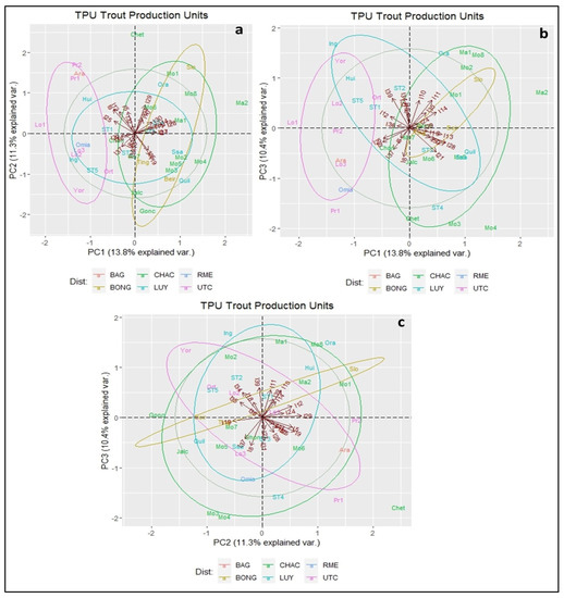 In the characterization of trout production, a diagnosis of the production units was carried out with the objective of recognizing the capability of the management system that will allow the assessment, evaluation and analysis of variables, causes, effects and trends of the Trout Production Units (TPUs) [16]. The information from the TPUs was collected from a survey related to socioeconomic aspects of the producer and environmental factors, which were used as the basis for the preparation of a questionnaire with indicators that were easily understood by the producers [17]. A total of 39 questions distributed in 3 dimensions were used. In the case of the social dimension, 12 questions were asked; for the economic dimension, 18 questions were asked; and finally, in the environmental dimension, 9 questions were coded for the respective processing and analysis. The TPUs were analyzed as production systems with social, economic and environmental variables that allowed the classification of production systems and the classification of homogeneous groups of trout producers in the Amazonas region. Multivariate analysis was also used to summarize and classify the data obtained from the surveys [18]. The information was tabulated in a spreadsheet (Excel). For the 39 variables evaluated, the coefficients of variation were calculated to discard those variables with low discriminatory power (<40%) and to take into consideration those variables that contribute to the multivariate analysis [19,20]. Similarly, 23 variables were used for the greatest discriminatory power for the principal component analysis, using the ggbiplot package. In addition, orthogonal rotation of the components (Varimax rotation) was used for a better interpretation of the variables. For the cluster analysis, Ward’s method was used, which allowed obtaining homogeneous groups of systems with similar characteristics (typologies), with minimum intra-group variability and maximum inter-group variability, for a better understanding of the analysis of the complexity of trout production systems [21].