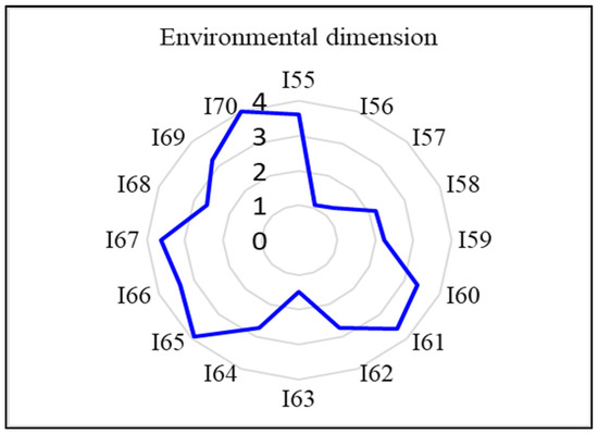 Levels of sustainability for sub-indicators of the environmental dimension in trout producing units in the Amazonas region. The blue line indicates the average level of sustainability per item (I) of the questionnaire.