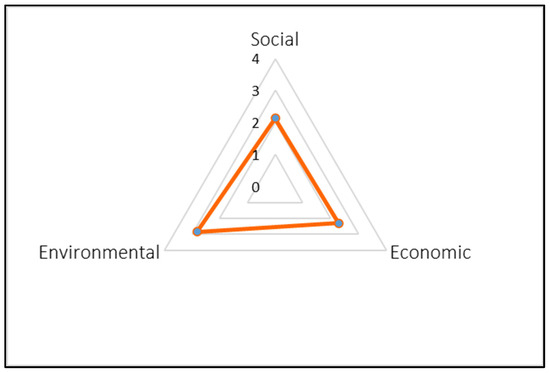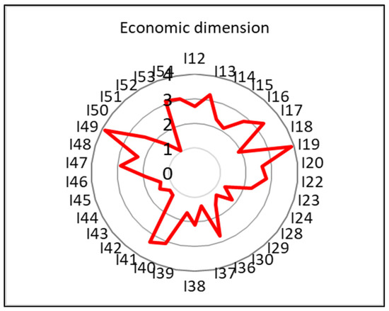 Regarding the economic sub-indicators, they represented a medium level of sustainability (2.1) with the following index values (from highest to lowest): economic performance level (2.6), operations and production (2.3), technical, research and development (1.4) (Figure 5, Table 5).
