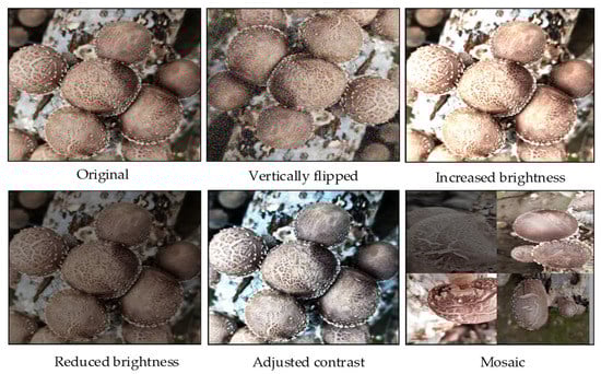 In this study, the dataset was expanded using data augmentation techniques to increase the variety of the experimental data, boost the model generalizability, and prevent overfitting. The fresh shiitake mushroom images were extended by using the following five techniques: rotation, Gaussian noise, contrast enhancement, brightness variation, and mosaic data enhancement [34,35], as shown in Figure 3. The first four enhancement techniques were implemented through the built-in Python-based OpenCV functions, whereas the mosaic method involves random cropping of four images stitched together into one new image as the training data. After these operations, the training set was expanded to 3184 images, the validation set to 563 images, and the test set to 662 images. The test set included a selection of data randomly adjusted for changes in brightness to simulate light sources.