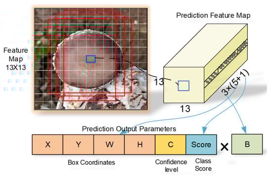 After prediction layers Y1, Y2, and Y3 are processed in the prediction network, the images are divided into 52 × 52, 26 × 26, and 13 × 13 grids, respectively, and three anchor frames are generated for each grid. During the training process, the anchor frame providing the target information is chosen as the prediction result after the sizes and locations of the anchor frames are continually changed. Prediction layer Y1 has a small grid, which is effective for finding tiny targets in the picture; prediction layer Y2 has a moderate grid, which is good for detecting intermediate targets; and prediction layer Y3 has a large grid, which is good for detecting large targets. The final prediction parameters for the picture are included in each channel of the prediction layer. The specific structure of the prediction layer (with a 13 × 13 grid as an example) is shown in Figure 5. The prediction parameters of each prediction layer include the prediction frame centre coordinates (X, Y), prediction frame length and width (W and H, respectively), prediction frame confidence level (C), score of fresh shiitake mushrooms in the prediction frame (Score), and the number of predicted bounding boxes for which each grid is responsible (B).