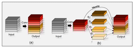 Process of extracting and generating feature maps by using the Ghost module. (a) Ordinary convolution; (b) Ghost module.