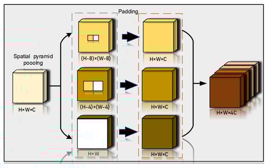 To fuse local and global features effectively and improve the model detection performance for small fresh shiitake mushrooms, the spatial pyramidal pooling (SPP) structure was incorporated into the backbone network of MYOLO [41,42,43]. SPP is a structure consisting of three different scales of maximum pooling layers, as shown in Figure 7. These are H: feature map height, W: width, and C: number of channels. First, the input H × W × C feature map is executed three times with different convolution kernel sizes in block pooling to extract feature information from different sizes of perceptual fields; second, the feature map is obtained by pooling operation to normalize its size. Next, the three feature maps are merged with the original feature map on the channels to obtain the H × W × 4C feature map. Finally, the spliced feature map is passed on the subsequent network to increase the perceptual field, enrich the expression capability of the final feature map, and enhance the detection performance of the model for small fresh shiitake mushrooms further.