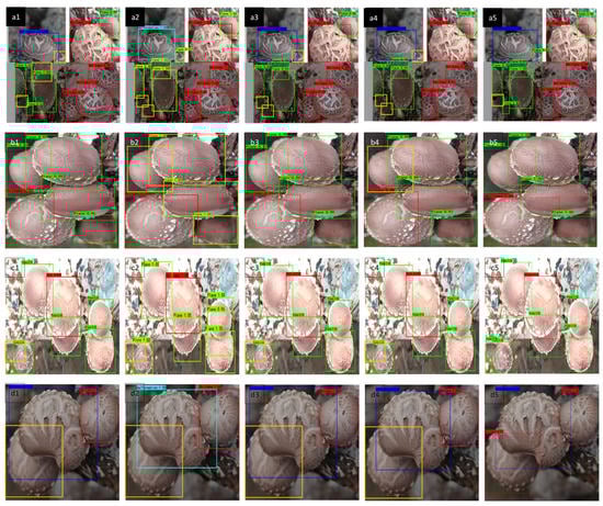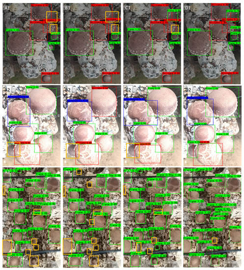 Figure 13 presents the detection results for the different models in the mushroom shed. The different species of fresh shiitake mushrooms are indicated by the different coloured bounding boxes; the yellow boxes correspond to missed fresh shiitake mushroom detections. Here, A1–A3 are the YOLOv3 detection results, B1–B3 are the YOLO-A detection results, C1–C3 are the YOLO-B detection results, and D1–D3 are the MYOLO detection results. Figure 13 demonstrates that the replacement of the backbone network, GhostNet16, does not influence the detection effect, but like in the original model, missed detection is more serious for dense occlusions and large field-of-view situations, as shown in B1 and B2. YOLO-B can detect small fresh shiitake mushrooms more accurately but still has some problems with mushroom localization, as depicted in C3. Using the ASA-FPN neck network MYOLO can detect mushrooms more accurately in dense occlusions and complex environments to maintain better detection, localization accuracy, and improves the missed detection under a large field of view effectively, as demonstrated by column D.