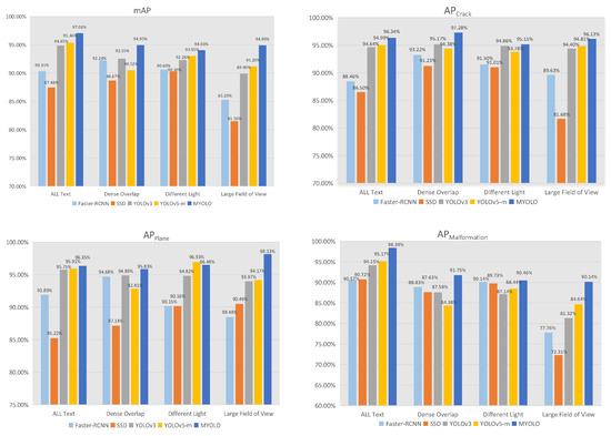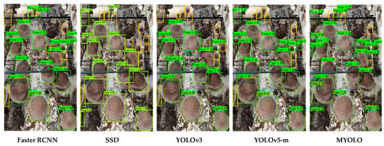 Table 4 shows the results of the ablation experiments performed on GhostNet16, SPP, and ASA-FPN networks using the test set. YOLO-A is the model with GhostNet16 applied; YOLO-B is the model with GhostNet16 and SPP applied; and YOLO-C is the model with GhostNet16, SPP, and ASA-FPN applied. YOLO-A exhibits no significant change in mAP compared to YOLOv3, but the number of model parameters is reduced by 38.65 MB, and the detection speed is reduced by 19.19 ms compared to Darknet53, which shows that utilizing the lightweight GhostNet16 as a backbone network can reduce the number of model parameters without affecting the detection accuracy. Furthermore, mAP improved by 0.74% for YOLO-B compared to YOLO-A and 1.39% for MYOLO compared to YOLO-B. The experimental results demonstrate that the models using SPP and ASA-FPN can improve the detection performance without significantly affecting the number of model parameters. The proposed MYOLO model improves the mAP by 2.18% and decreases the number of model parameters by 32.16M. Therefore, the ablation experiments show that MYOLO is effective and feasible, considering the balance between model parameters and accuracy.