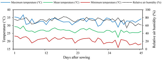Daily maximum, mean, and minimum temperatures and average relative air humidity observed in the internal area of the greenhouse during the experimental period.