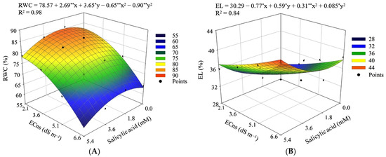 Response surface for relative water content—RWC (A)—and percentage of electrolyte leakage in the leaf blade—% EL (B) of Japanese cucumber—as a function of the interaction between the electrical conductivity of the nutrient solution (ECns) and the concentrations of salicylic acid (SA), grown in a hydroponic system, 40 days after transplanting. X and Y—concentration of SA and ECns, respectively; * and ** significant at a p ≤ 0.05 and p ≤ 0.01, respectively.
