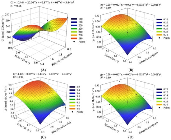 Response surface for internal CO2 concentration—Ci (A), stomatal conductance—gs (B), transpiration—E (C), and CO2 assimilation rate—A (D) of Japanese cucumber as a function of the interaction between the electrical conductivity of the nutrient solution (ECns) and the concentrations of salicylic acid (SA), grown in a hydroponic system, 40 days after transplanting. X and Y—concentration of SA and ECns, respectively; * and ** significant at a p ≤ 0.05 and p ≤ 0.01, respectively.