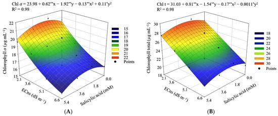 The increase in the ECns reduced the chlorophyll a (Figure 6A) and chlorophyll total (Figure 6B) contents of cucumber plants. However, the foliar application of SA up to concentration of 2.0 mM reduced the effects of saline stress, promoting increments in Chl a and Chl t, even when plants were subjected to the highest ECns (6.6 dS m−1). The highest values of chlorophyll a (21.17 μg mL−1) and chlorophyll total (28.76 μg mL−1) were obtained in plants cultivated with ECns of 2.1 dS m−1 and SA concentration of 2.0 mM, corresponding to increments of 3.61% (0.74 μg mL−1) in chlorophyll a and 3.50% (0.97 μg mL−1) in chlorophyll total for plants cultivated with the same salinity level (2.1 dS m−1) and without the application of SA (0 mM). On the other hand, the application of SA on leaves at concentrations greater than 2.0 mM intensified the harmful effects of saline stress, with the lowest values of chlorophyll a (15.66 μg mL−1) and chlorophyll total (20.23 μg mL−1) in plants subjected to ECns of 6.6 dS m−1 and SA concentration of 5.4 mM.
