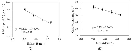 The synthesis of chlorophyll b (Figure 6C) and carotenoids (Figure 6D) of cucumber plants were negatively affected by the increase in the electrical conductivity of the nutrient solution, with reductions, per unit increment in ECns, of 7.46% in chlorophyll b content and 3.82% in carotenoid content. Comparing the chlorophyll b and carotenoid contents of plants grown under ECns of 6.6 dS m−1 to those of plants subjected to ECns of 2.1 dS m−1, reductions of 39.9% (3.21 μg mL−1) and 18.17% (1.17 μg mL−1) were observed, respectively.