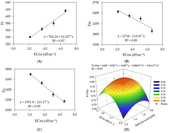 Initial fluorescence—F0 (A), maximum fluorescence—Fm (B), and variable fluorescence—Fv (C) as a function of electrical conductivity of the nutrient solution (ECns) and response surface for the quantum efficiency of photosystem II—Fv/Fm (D) of Japanese cucumber as a function of the interaction between ECns and the concentrations of salicylic acid (SA), grown in a hydroponic system, 40 days after transplanting. X and Y—concentration of SA and ECns, respectively; ** significant at p ≤ 0.01. Vertical lines represent the standard error of the mean (n = 4).
