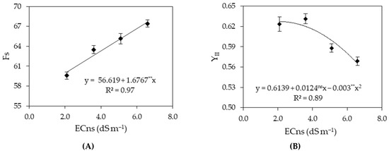 Initial fluorescence before the saturation pulse—Fs (A) and the quantum efficiency of photosystem II in the light phase—YII (B) of Japanese cucumber as a function of the levels of electrical conductivity of the nutrient solution (ECns), grown in a hydroponic system, 40 days after transplanting. ns and **, respectively, not significant and significant at a p ≤ 0.01. Vertical lines represent the standard error of the mean (n = 4).