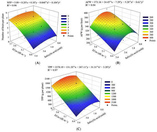 Response surface for the number of fruits per plant—NFP (A), average fruit weight—AFW (B), and total production per plant—TPP (C) of Japanese cucumber as a function of the interaction between the electrical conductivity of the nutrient solution (ECns) and the concentrations of salicylic acid (SA), grown in a hydroponic system, 45 days after transplanting. X and Y—concentration of SA and ECns, respectively; * and ** significant at a p ≤ 0.05 and p ≤ 0.01, respectively.