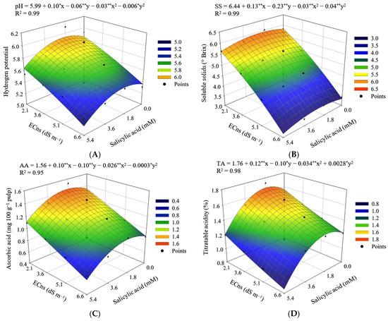 For the data collected in this study regarding relative water content, the percentage of electrolyte leakage, photosynthetic pigments, leaf gas exchange parameters, chlorophyll fluorescence, production components and yield, and post-harvest quality, the levels of sources of variation, electrical conductivity of the nutrient solution (ECns), and salicylic acid (SA) concentrations were explored and submitted to the distribution normality test (Shapiro–Wilk) to verify if the data obeyed normal distribution. Then, the analysis of variance (ANOVA) was realized and, in cases of significance, being the quantitative factors, linear and quadratic regression analyzes were performed using the SISVAR-ESAL statistical program [38]. The definition of the model (linear or quadratic) was based on the values of the coefficient of determination (R2) and the biological significance of the phenomenon. Further, the effects of the interaction (ECns × SA) were analyzed using response surface curves, prepared with the SigmaPlot v.12.5 software.