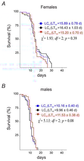Longevity of 5–7-day old mated females (A) and males (B) of Drosophila suzukii exposed to low concentrations (LC0, LC5 and LC20) of Eucalyptus globulus essential oil.