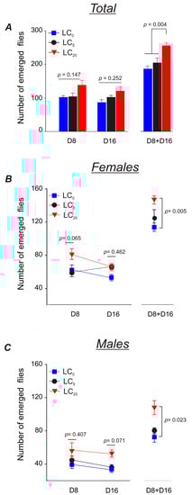 Females’ fertility was assessed by counting the number of emerged females and males and the total (females + males) adults at 8 and 16 days as well as the aggregate of the numbers of adults emerged during the whole experiment (Day 8 + Day 16; Figure 2). Both at Days 8 and 16, no statistical significant differences were found for the total number of males and females (Day 8: F = 2.262; df = 2; p = 0.147; and Day 16: F = 2.182; df = 2; p = 0.252; Figure 2A), the number of females (Day 8: F = 3.462; df = 2; p = 0.065; and Day 16: F = 0.825; df = 2; p = 0.462; Figure 2B), and the number of males (Day 8: F = 0.970; df = 2; p = 0.407; and Day 16: F = 3.327; df = 2; p = 0.071; Figure 2C) of emerged flies between the treatments exposed to LC5 and LC20 of essential oil and the unexposed control (LC0). Interestingly, when the aggregate of the numbers of adults that emerged during the whole experiment (Day 8 + Day 16) were compared, significant statistical differences were found between exposure to the control (LC0) and the LC20 for the total (females + males: F = 8.844; df = 2; p = 0.004; Figure 2A), for female (F = 14.463; df = 1; p = 0.005; Figure 2B), and for male (F = 7.797; df = 1; p = 0.023; Figure 2C) flies produced.